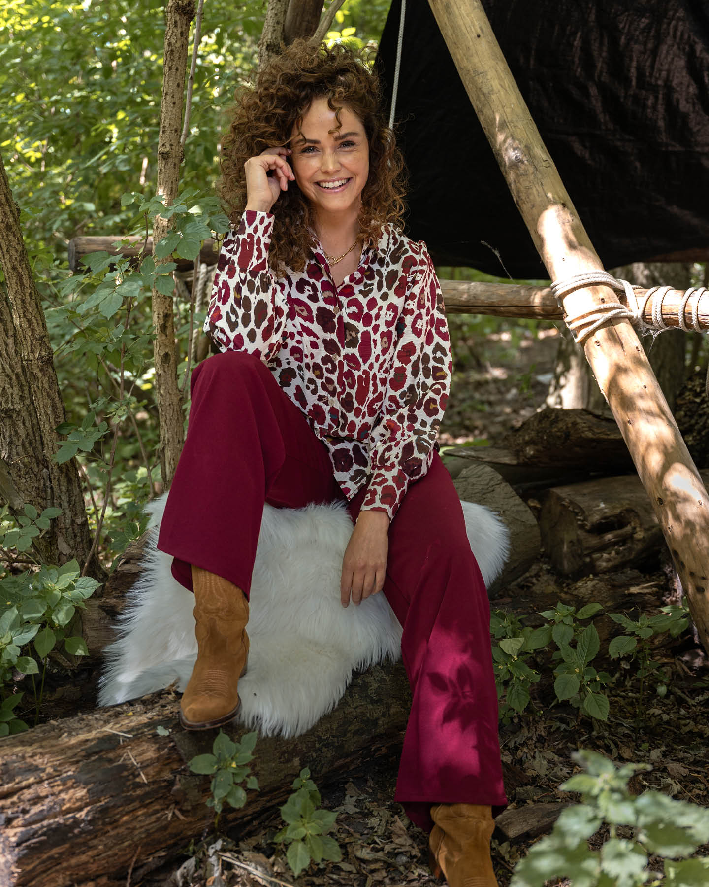 Blouse Evita met een animal print in trendy bordeaux is een echte blikvanger met een tijdloze uitstraling. De licht getailleerde, rechtvallende pasvorm geeft een elegante look die je zowel casual als gekleed kunt dragen. De lange mouwen zijn voorzien van een subtiel poffertje op de schouder – een stijlvol detail dat zorgt voor een speels accent. De klassieke kraag, knoopsluiting en ronde zoom maken deze blouse tot een veelzijdig kledingstuk voor elke dag. De manchetten zijn afgewerkt met knopen voor een nette afwerking. Evita is in dit dessin ook verkrijgbaar in navy.