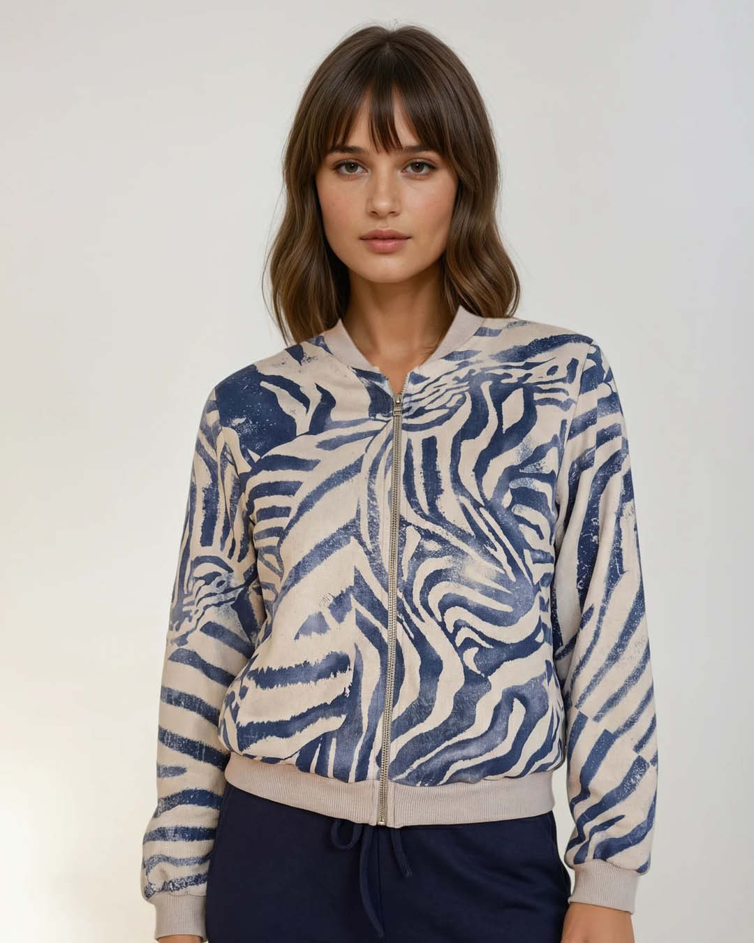 De Bomberjack Bambi in Jeans is uitgevoerd met een grafisch dessin en gemaakt van een suede stretch kwaliteit. Stoer bomberjack met ritssluiting welke eindeloos is te combineren.
