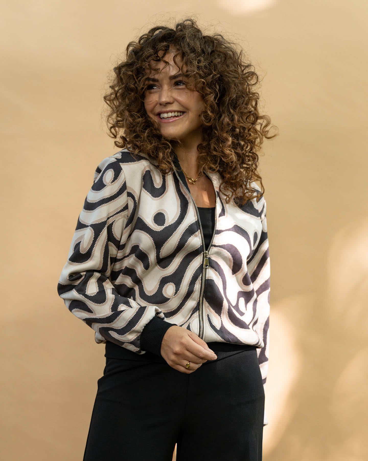 Draag Bambi als licht jack over een basic top of combineer het met een effen broek voor een gebalanceerde look. De heuplengte maakt dit model geschikt voor elke dag. Verkrijgbaar in zwart – een tijdloze kleur die overal bij past.