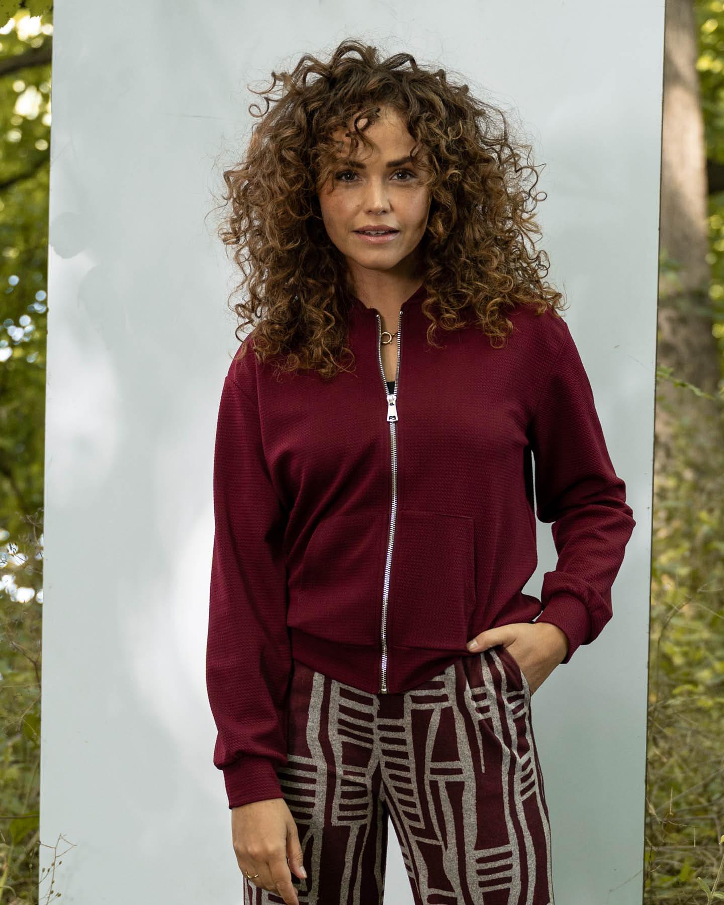 Bomberjack Izzy is de ideale mix van sportief en trendy. Gemaakt van een comfortabele, stretchy wafelstof en uitgevoerd in een trendy bordeaux kleur, is dit jack perfect voor elke casual look. De losvallende pasvorm en de elastische boorden zorgen voor een relaxte fit die je makkelijk over je outfit draagt.