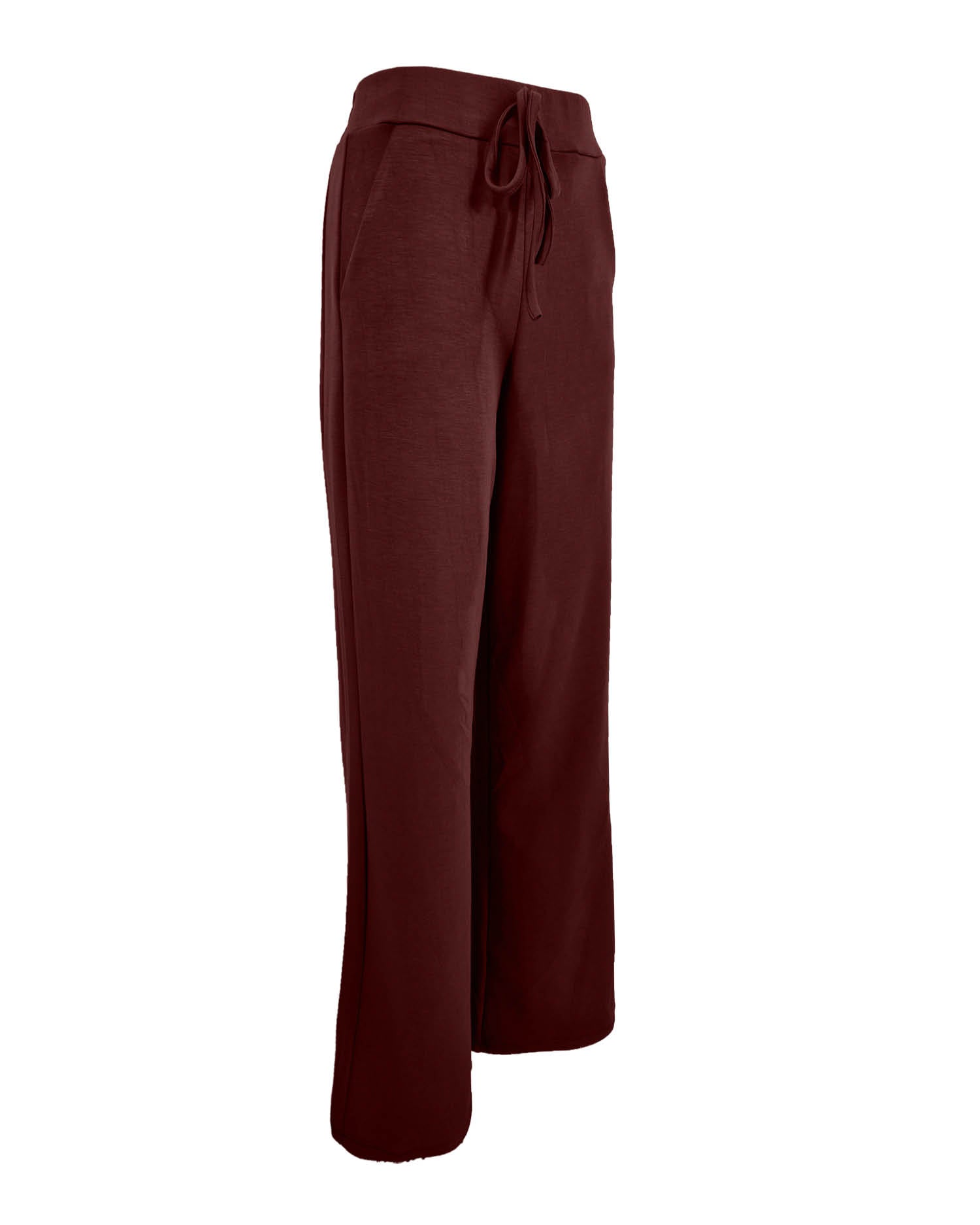Broek Ria is hét item voor een casual, comfortabele look met een vrouwelijke touch. Deze broek in een modieuze bordeau rode kleur heeft een losvallende pasvorm met elegante wijde pijpen, waardoor je outfit meteen een luchtige en trendy uitstraling krijgt. De elastische tailleband met koordsluiting zorgt voor een perfecte pasvorm en extra draagcomfort.