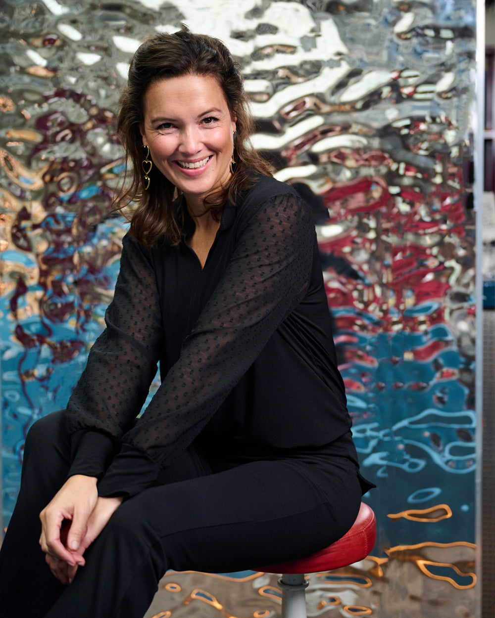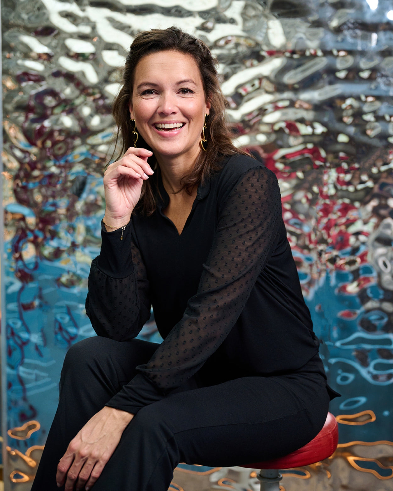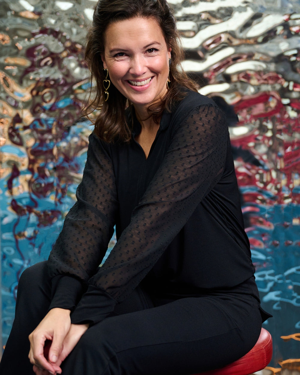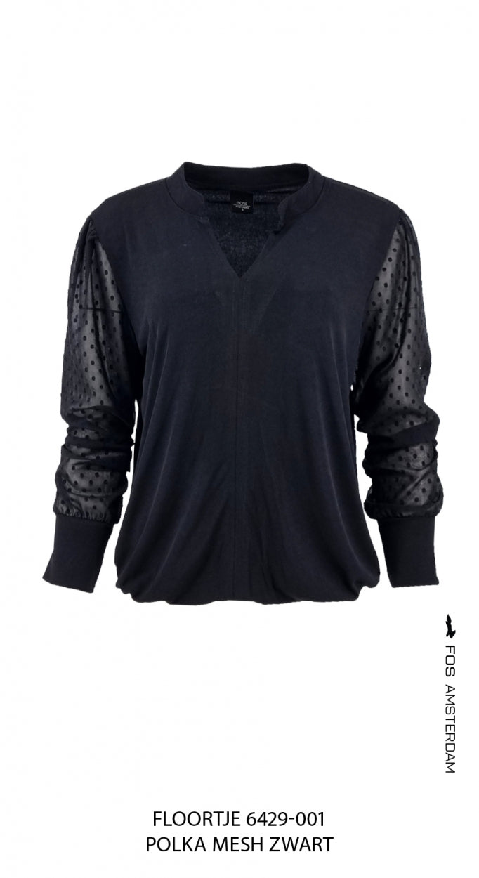 Floortje, een vrouwelijke top met een mooie V hals en een half staand kraagje zoals haar zomer zusje Doortje, de top heeft een pof mouw met breed manchet en een elastiek onder voor een mooi blousend effect.