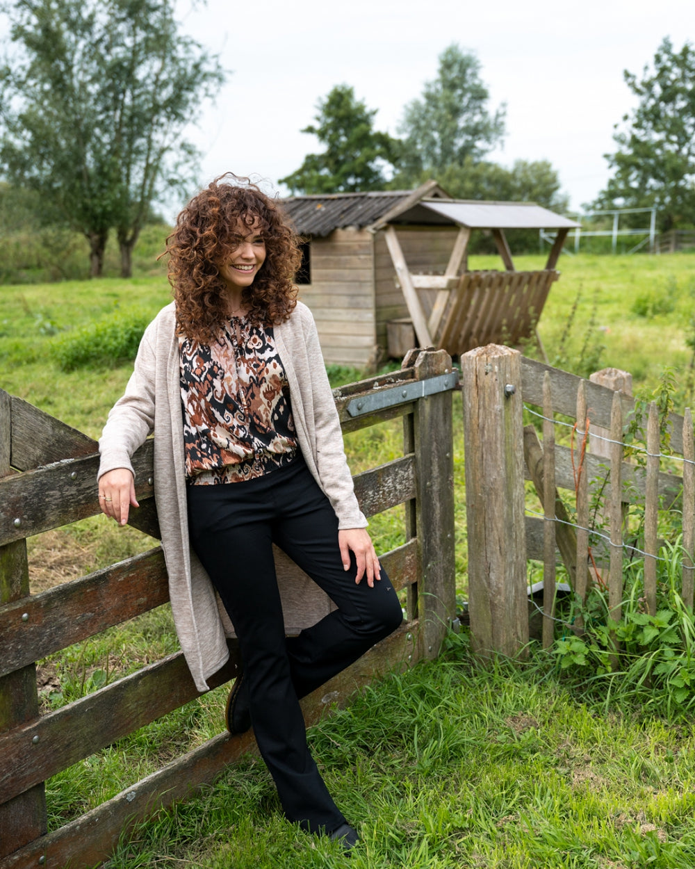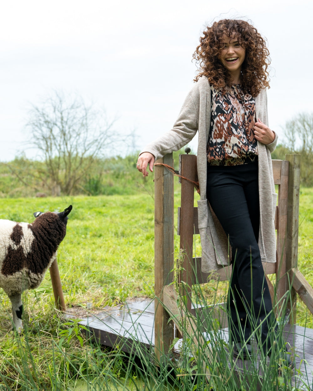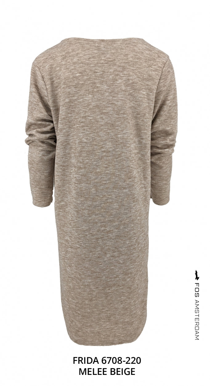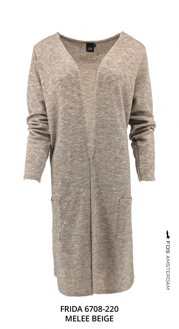 De ideale aanvulling op uw najaarsgarderobe: Frida is een lange cardigan zonder sluiting in licht breisel met twee zakken op de voorkant. De mouwen zijn lang en sluiten goed aan.