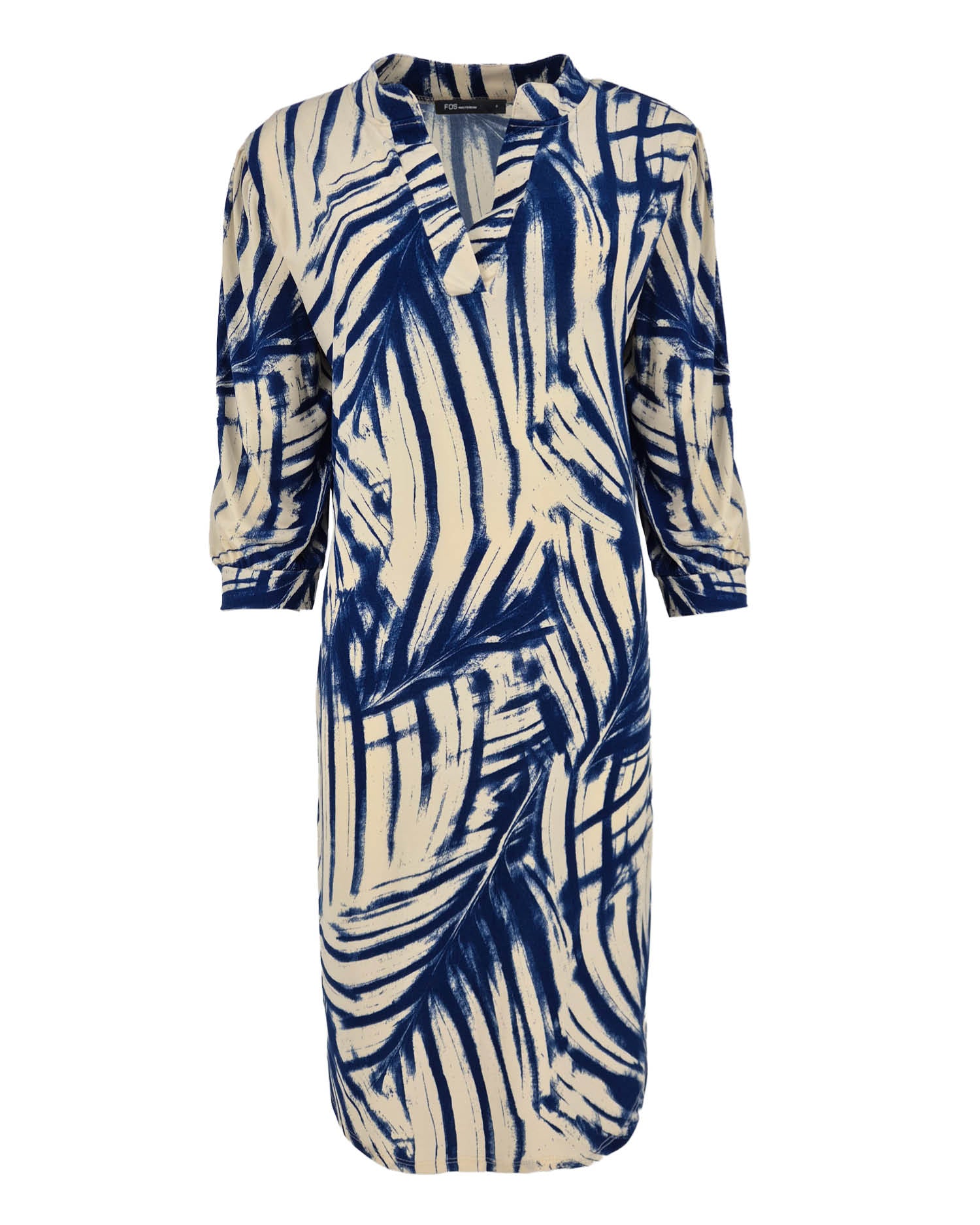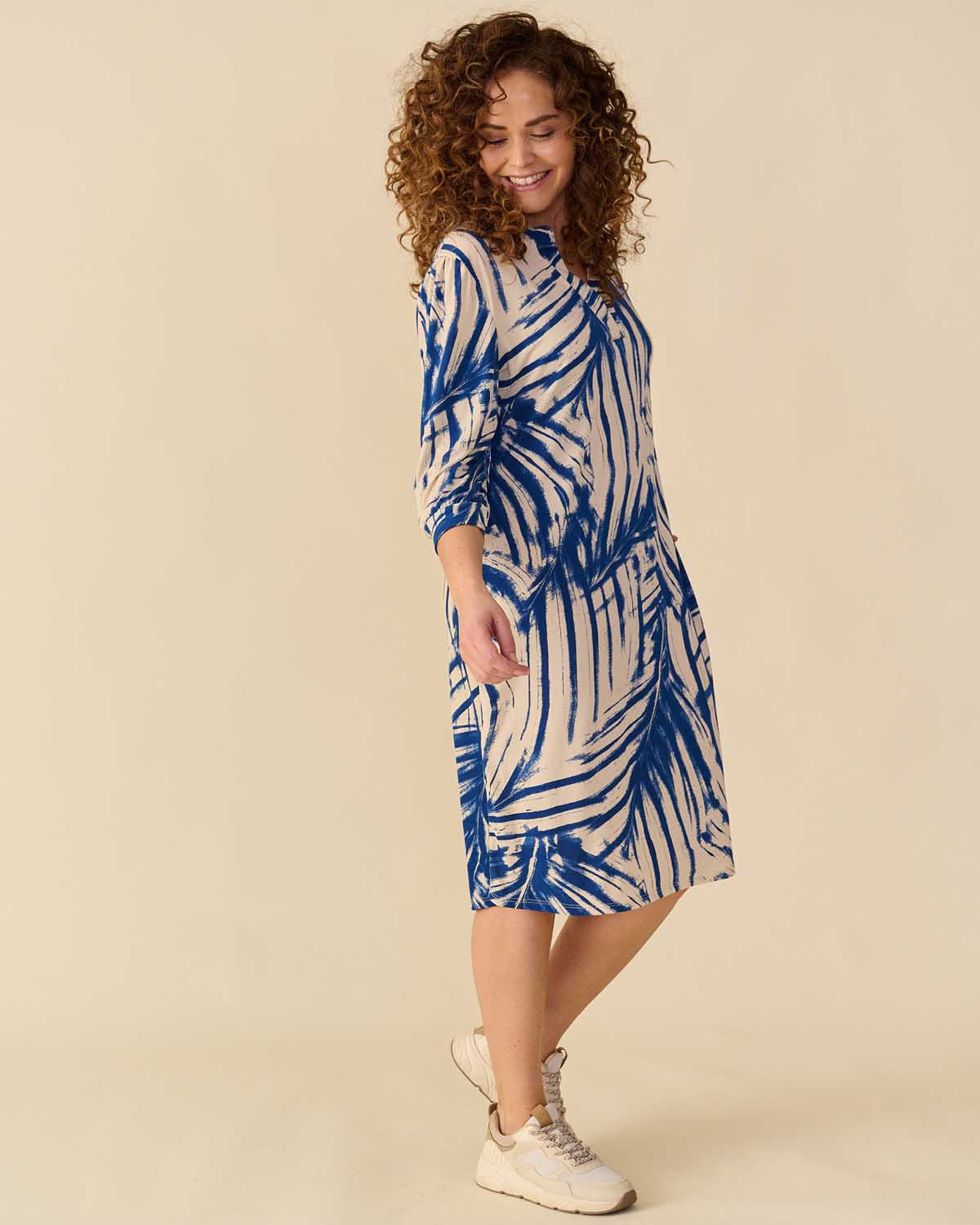 Verkrijgbaar in meerdere kleuren zoals lime, jeans. Jeans geeft de jurk een moderne en rustige uitstraling. Deze kleur maakt het grafische dessin subtieler. De combinatie van Andrien losvallende jurk en jeans met grafisch dessin maakt dit item uniek.