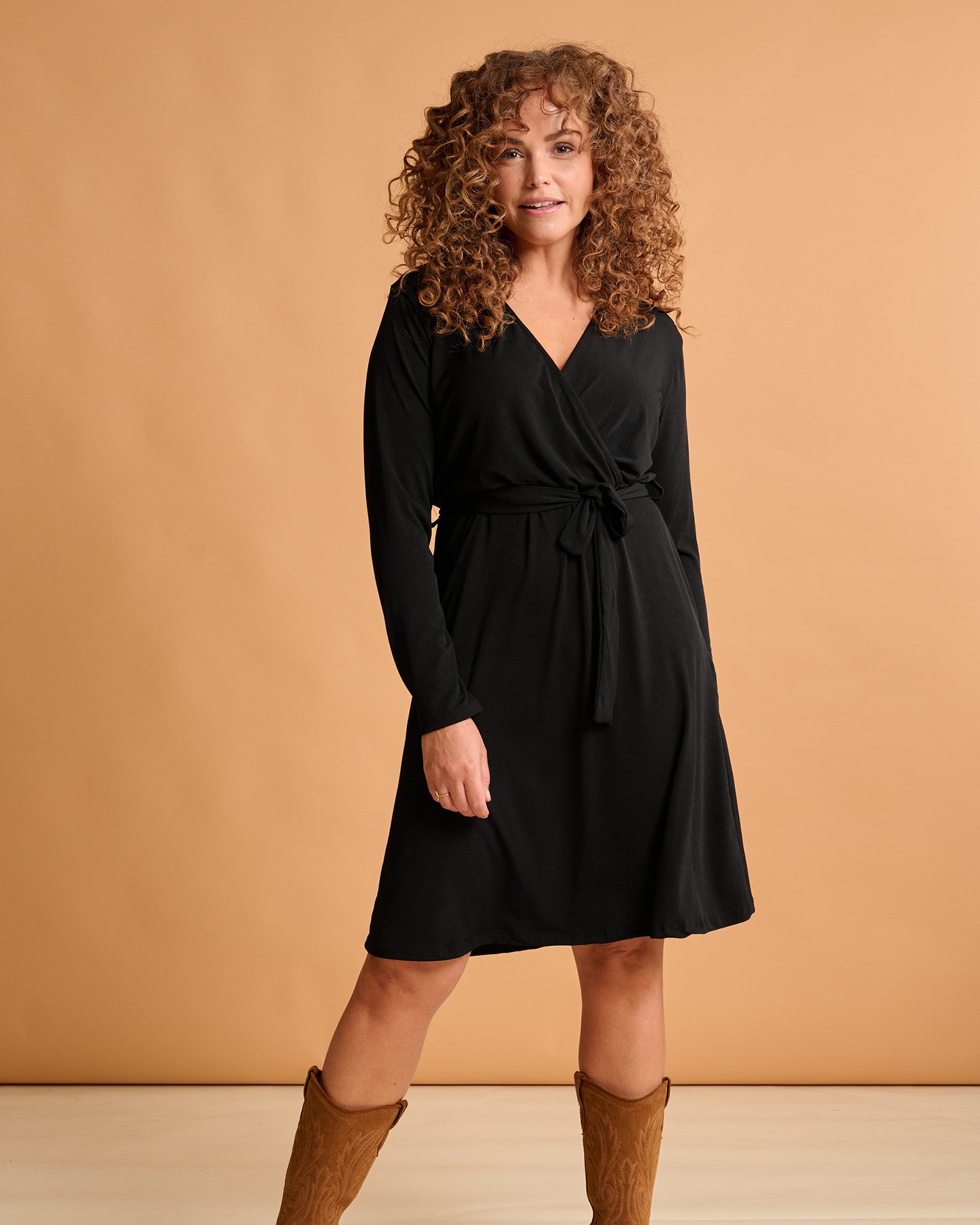 Met een overslag V-hals, striksluiting in de taille en een uitlopende rok, geeft de Joyo een mooi vrouwelijk silhouet. De hoge taille en knielengte zorgen voor een flatterende pasvorm die geschikt is voor zowel werk als een avondje uit. Dit model is geïnspireerd op onze populaire Joya jurk, maar dan in een iets kortere, praktische lengte.