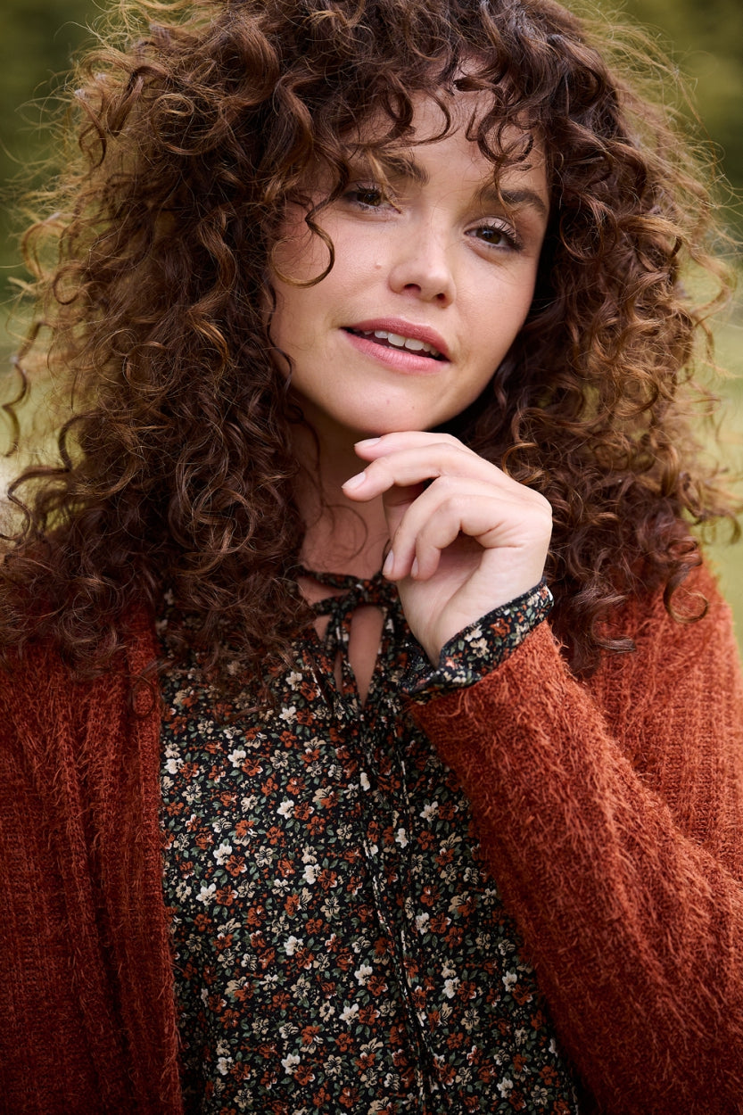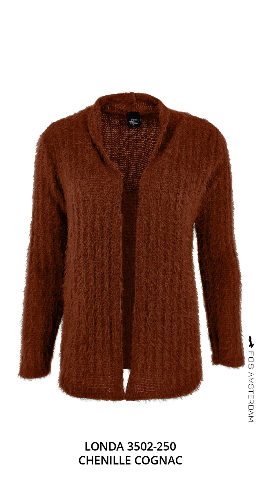Londa, het ‘chenille’ vest van heerlijke zachte fluffy kwaliteit. Het is een open vAlled model met sjaalkraag en valt op de broek rand.