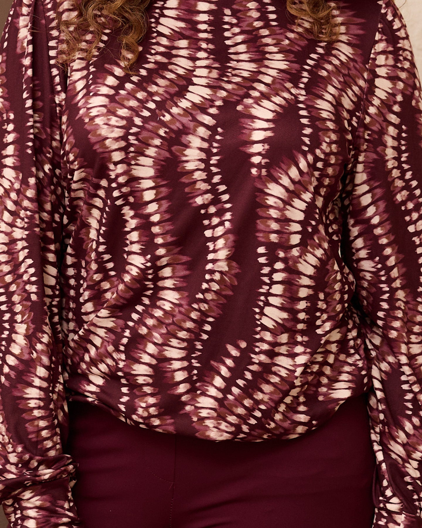 De blouson Adina in beaujolais is een elegant en cosy truitje dat een stijlvolle touch geeft aan iedere outfit. Het halfopstaande kraagje zorgt voor een verfijnd accent, terwijl de brede elastische manchetten en elastische onderkant een subtiel balloneffect creëren. De plooitjes op de schouders maken het ontwerp extra bijzonder en geven een speels detail.