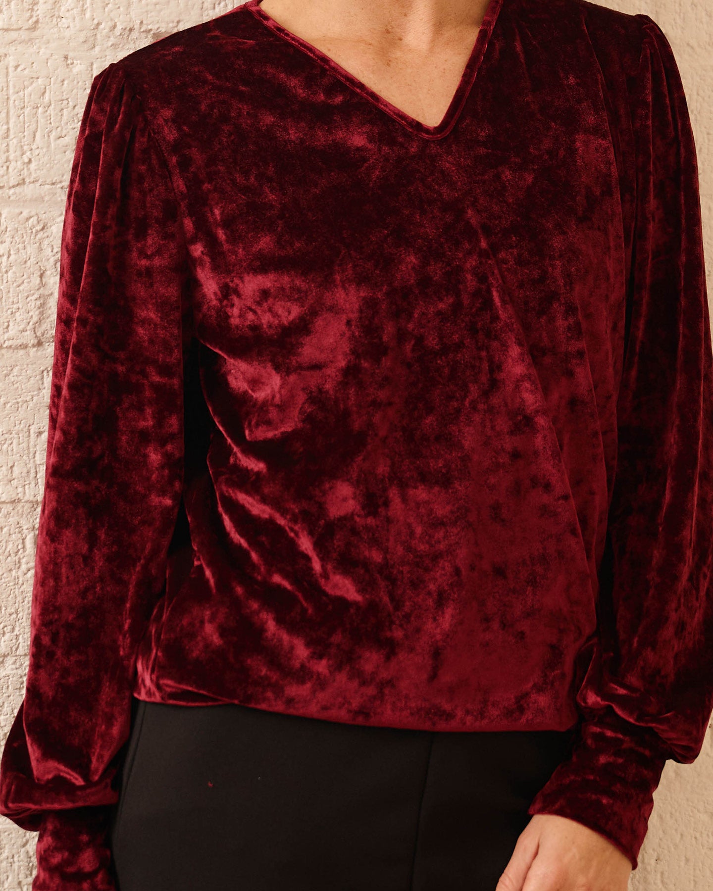 De blouson Bella in beaujolais is gemaakt van een zachte velours kwaliteit die een rijke glans geeft. De rechte pasvorm met elastische band aan de onderkant creëert een moderne, comfortabele look. Met zijn V-hals en lange mouwen is Bella de ideale mix tussen chic en relaxed. Verkrijgbaar in beaujolais, bruin en zwart.