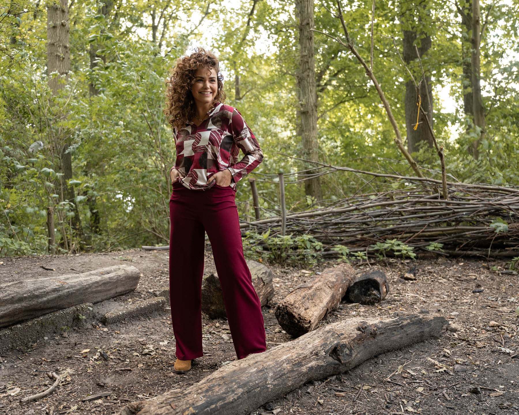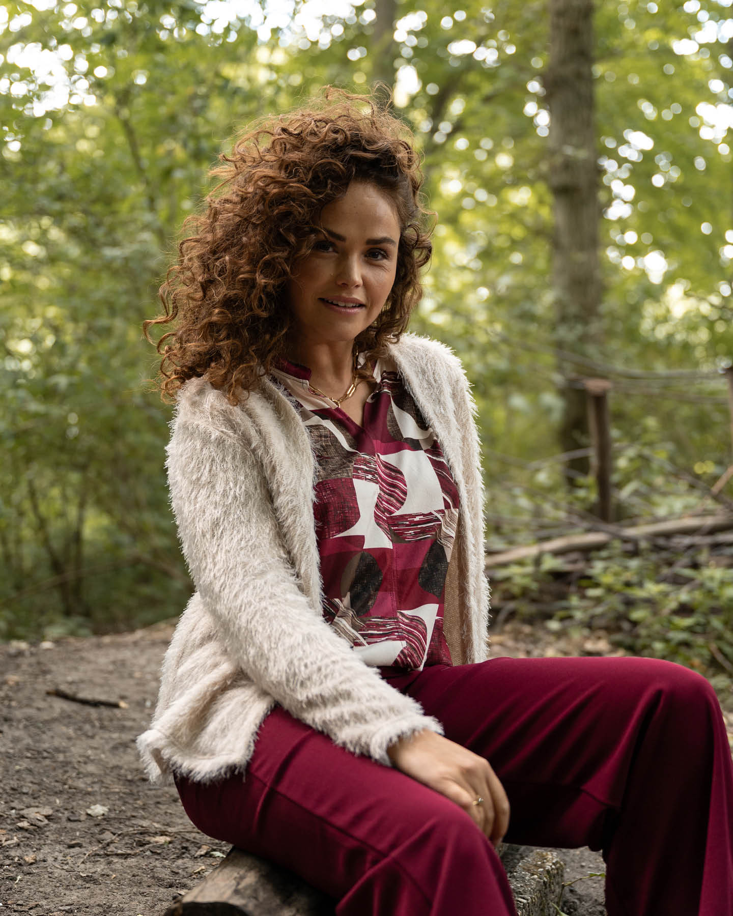 Blouson Didi is een stijlvolle top in een cosy fijnbrei kwaliteit, ideaal voor een vrouwelijke en verzorgde look. De diepe bordeauxkleur in combinatie met het stoere Geo Grid dessin geeft de top een chique en tijdloze uitstraling. Dankzij de losse pasvorm en zachte stof valt het model soepel om het lichaam.