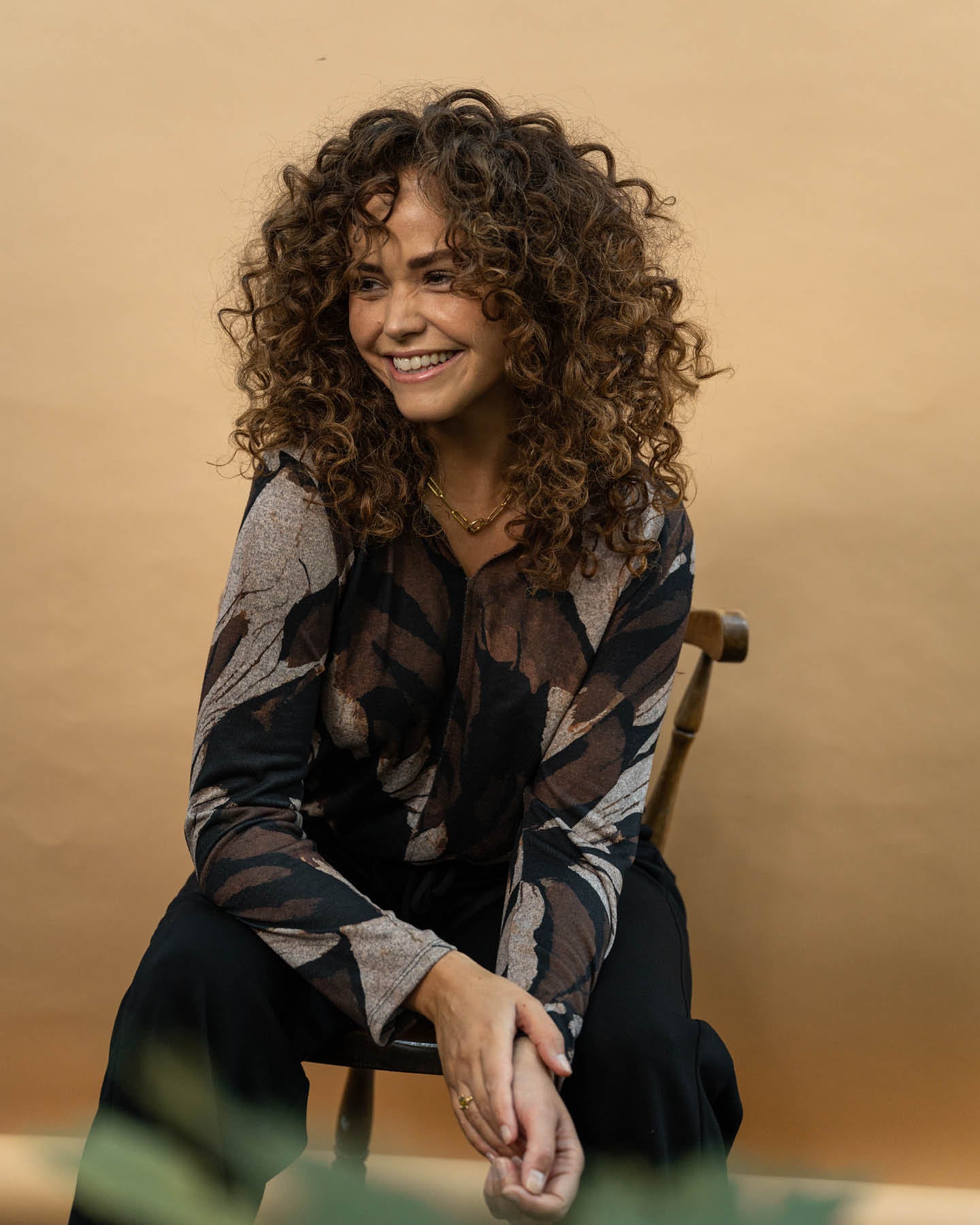 De V-hals met opstaande kraag geeft het geheel een elegante uitstraling, terwijl de lichte plooitjes op de schouders en de naden aan de voorkant de vrouwelijke vormen mooi accentueren. Het Wings-dessin maakt deze blouson extra bijzonder en zorgt voor een verfijnde, tijdloze look.