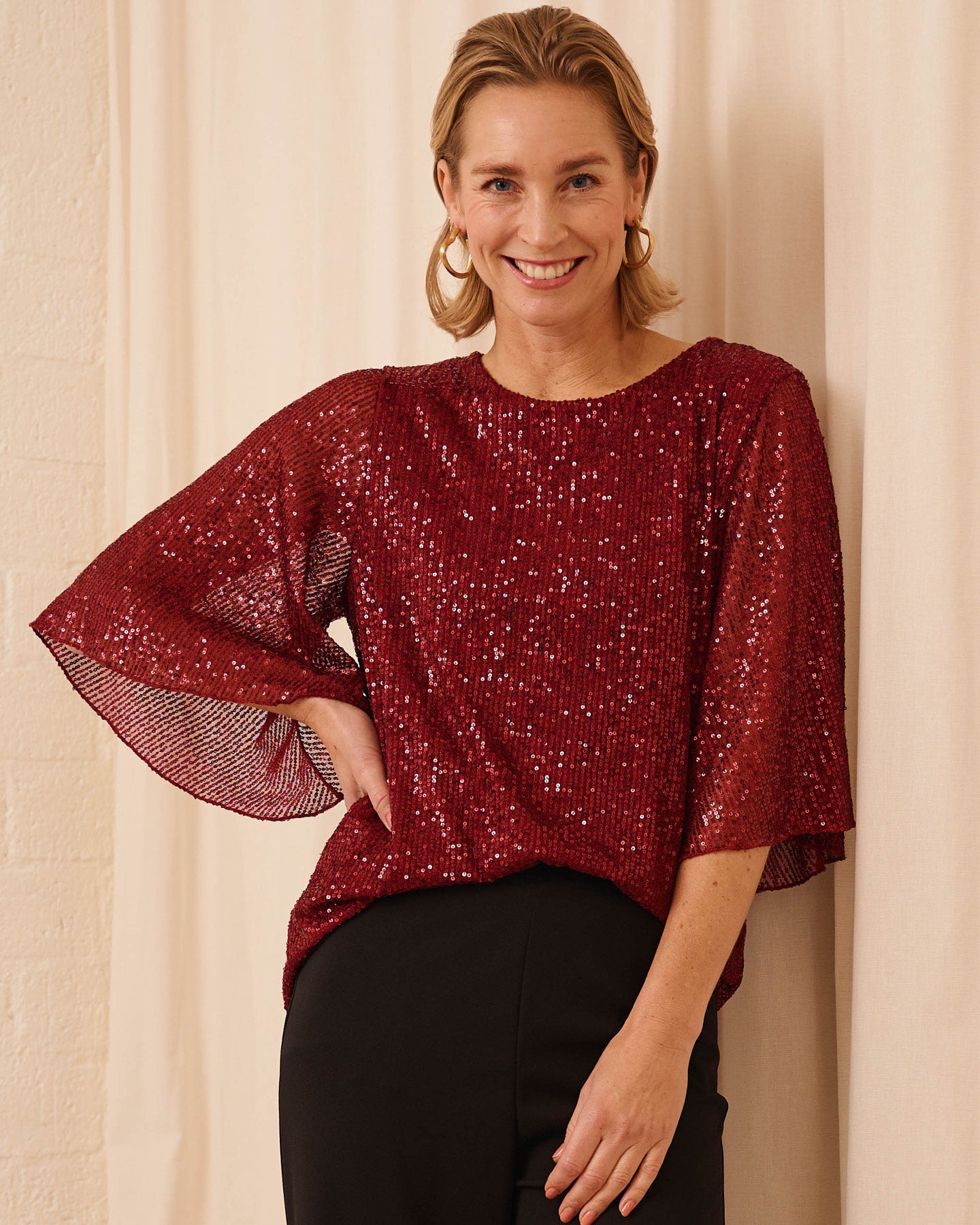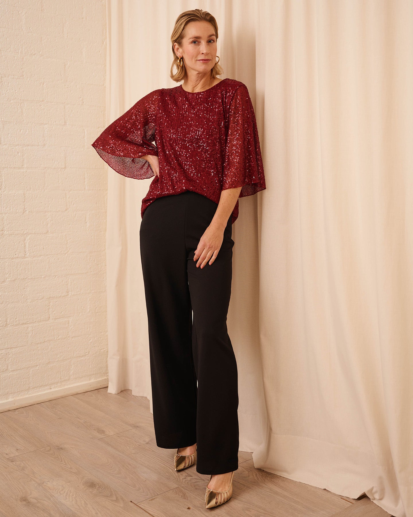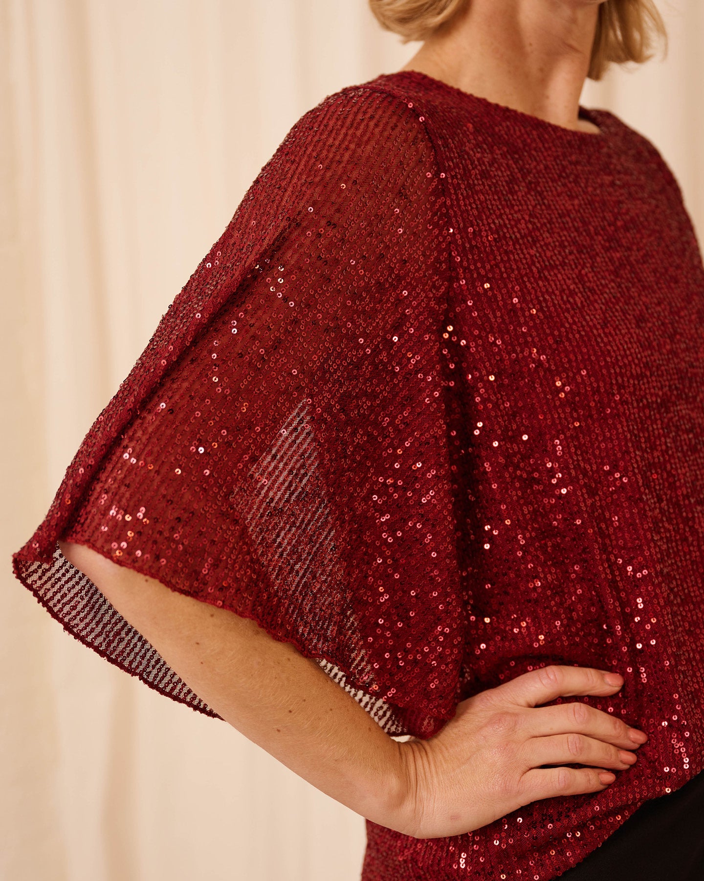 Top Mariposa in beaujolais is rijk aan pailletten en gevoerd met viscose voor extra draagcomfort. De ronde hals en korte, wijde mouwen geven een feestelijke, flatterende vorm. Ideaal als statement boven een pantalon of rok.