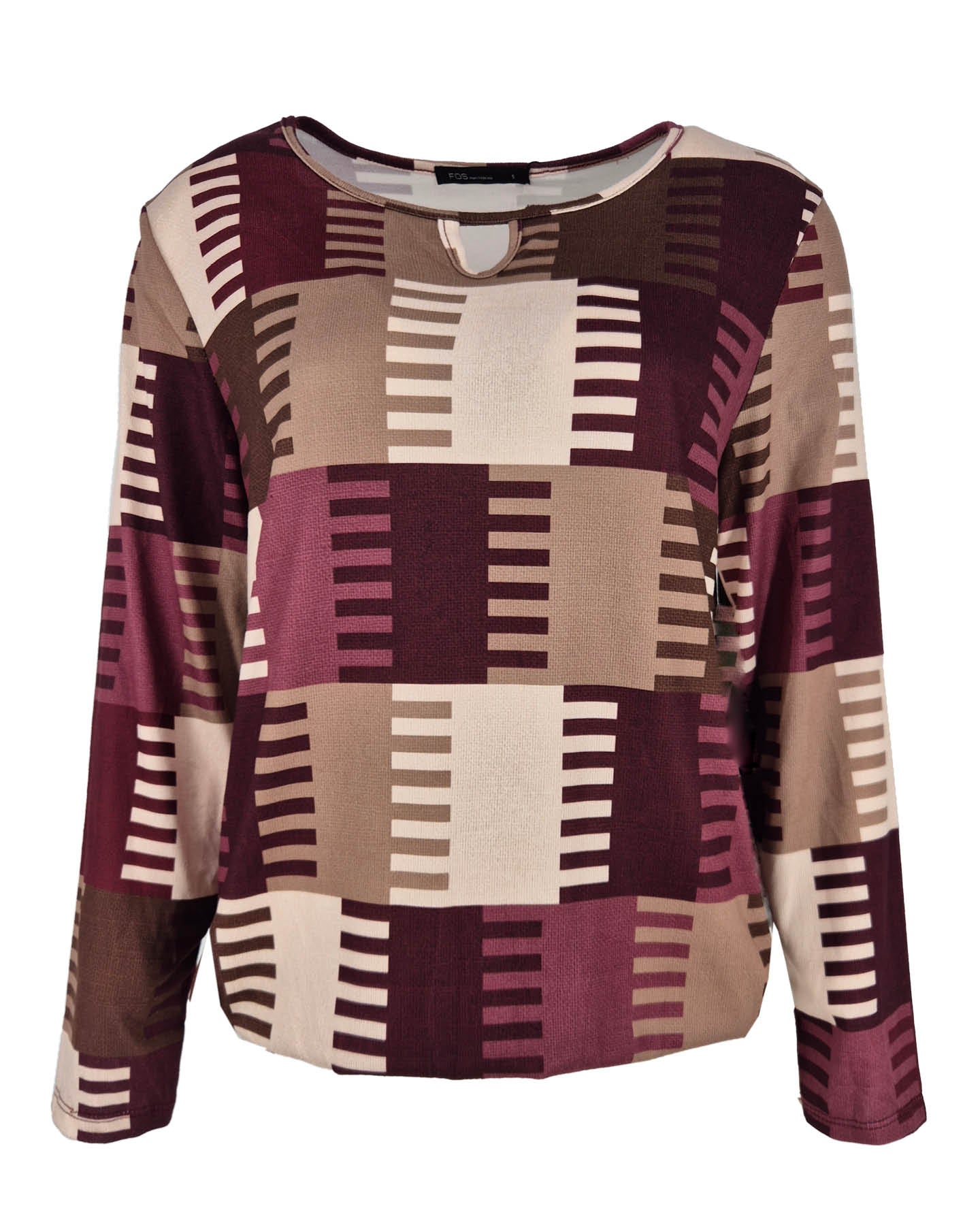 De Mimi-blouson in beaujolais heeft een klassiek karakter met een losvallende pasvorm en elastische onderkant. De fijnbrei kwaliteit en het grafisch dessin geven deze top een moderne touch. Met ronde hals en V-opening voor een vrouwelijk accent. Verkrijgbaar in beaujolais en navy.