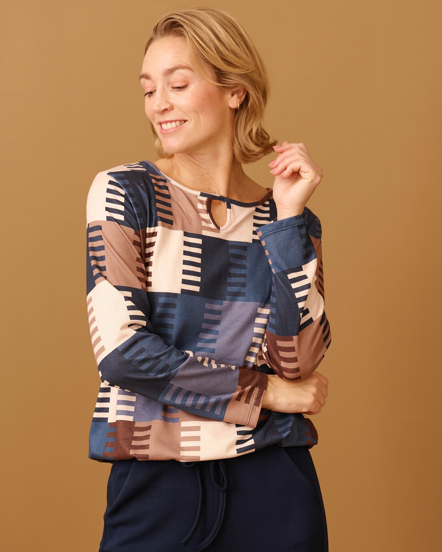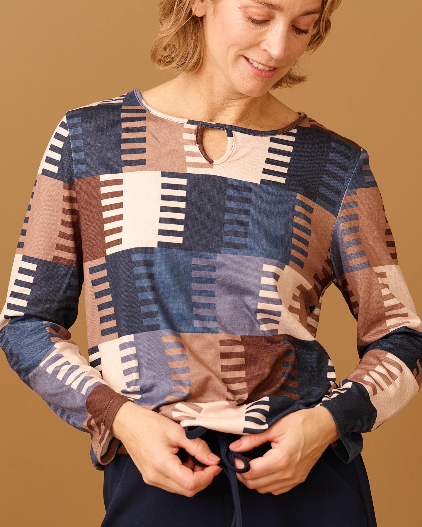 De Mimi-top in navy is gemaakt van zachte fijnbrei stof en heeft een stijlvol grafisch dessin. De ronde hals met V-opening en losvallende snit zorgen voor comfort en bewegingsvrijheid. Ideaal voor elke dag met een verzorgde uitstraling. Verkrijgbaar in navy en beaujolais.