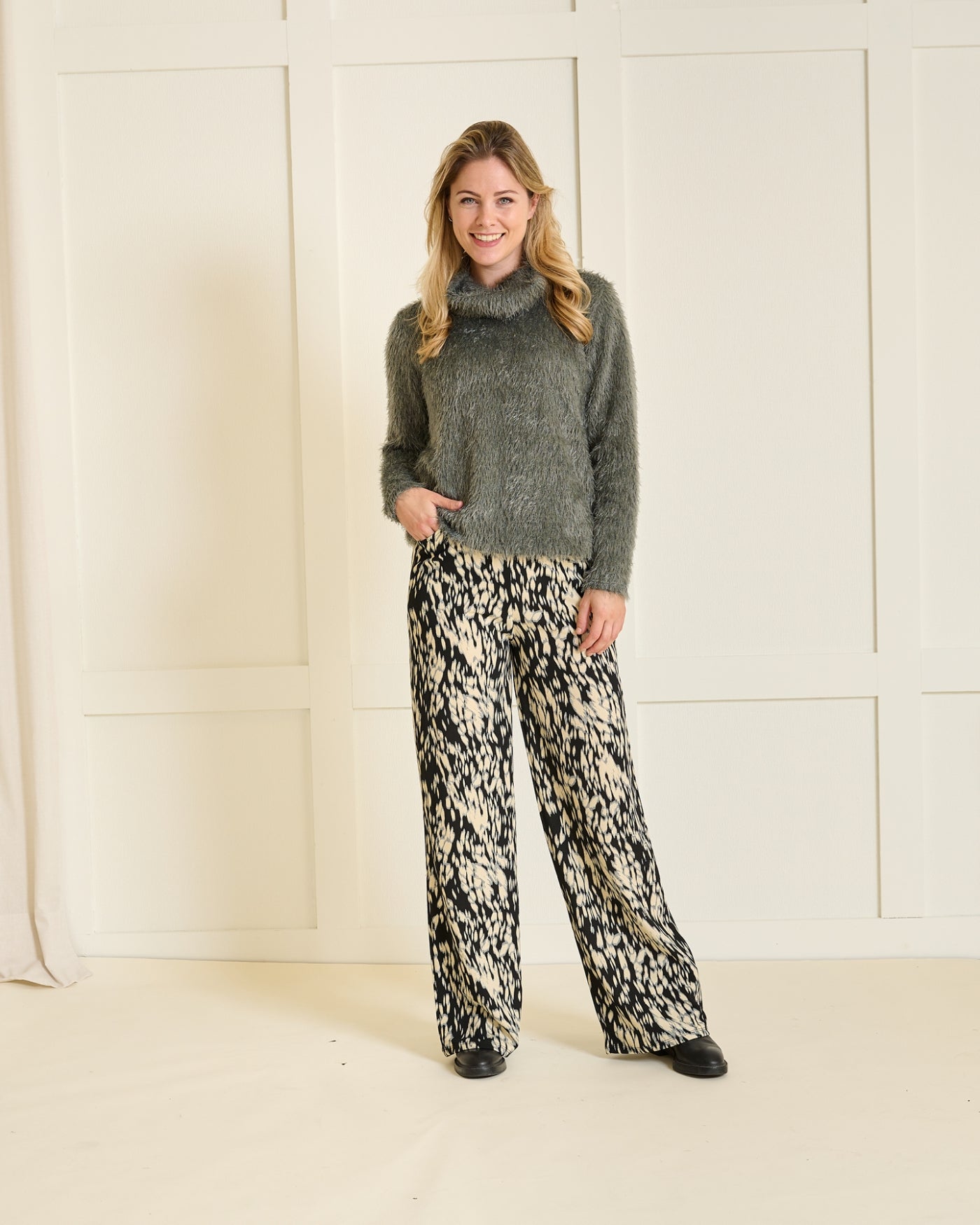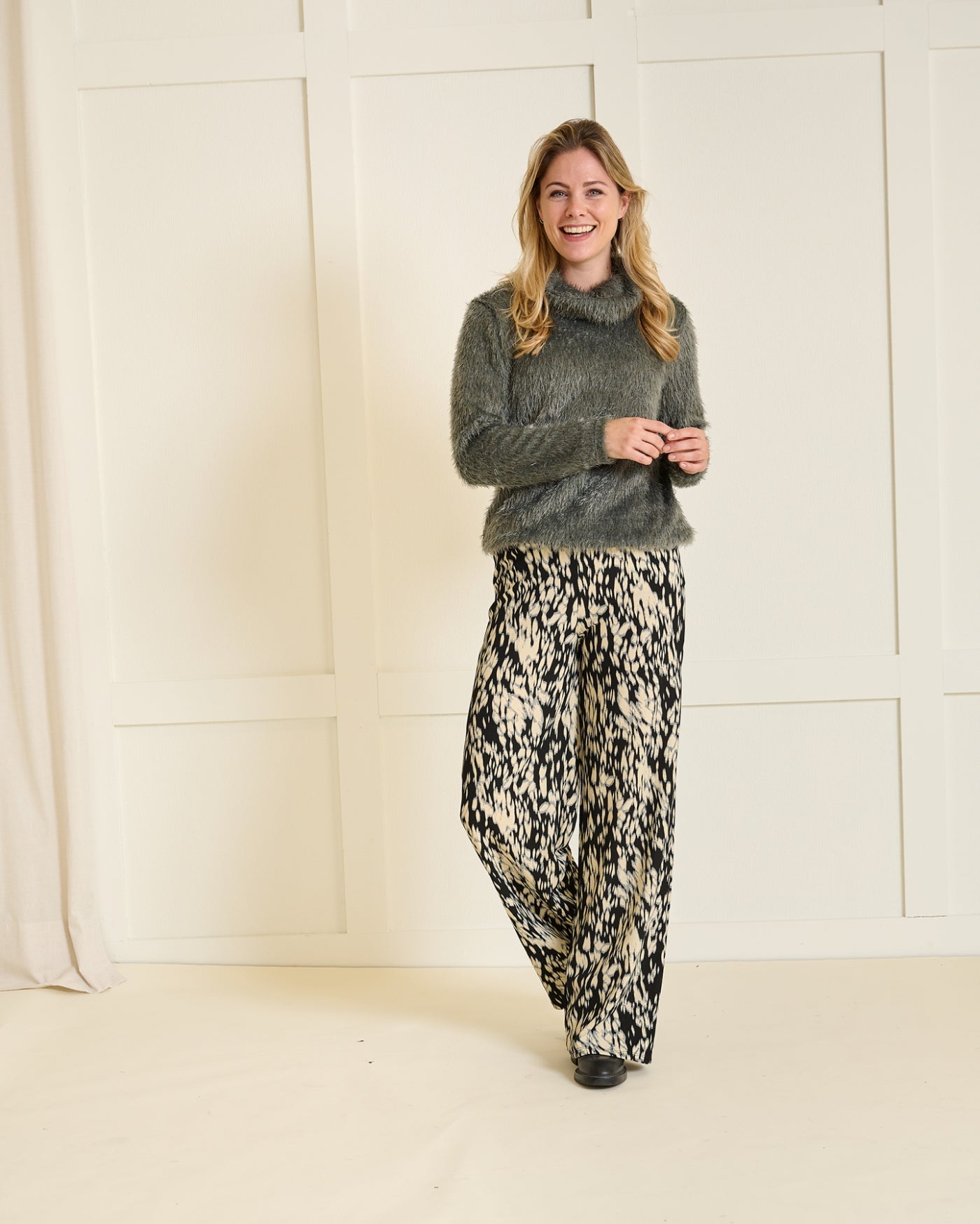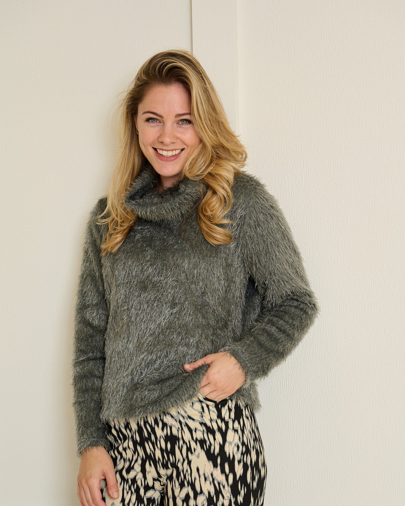 Nico, een cosy truitje met een wijde col in een rijke chenille kwaliteit. Het elastiekje onder creëert een blousend effect.