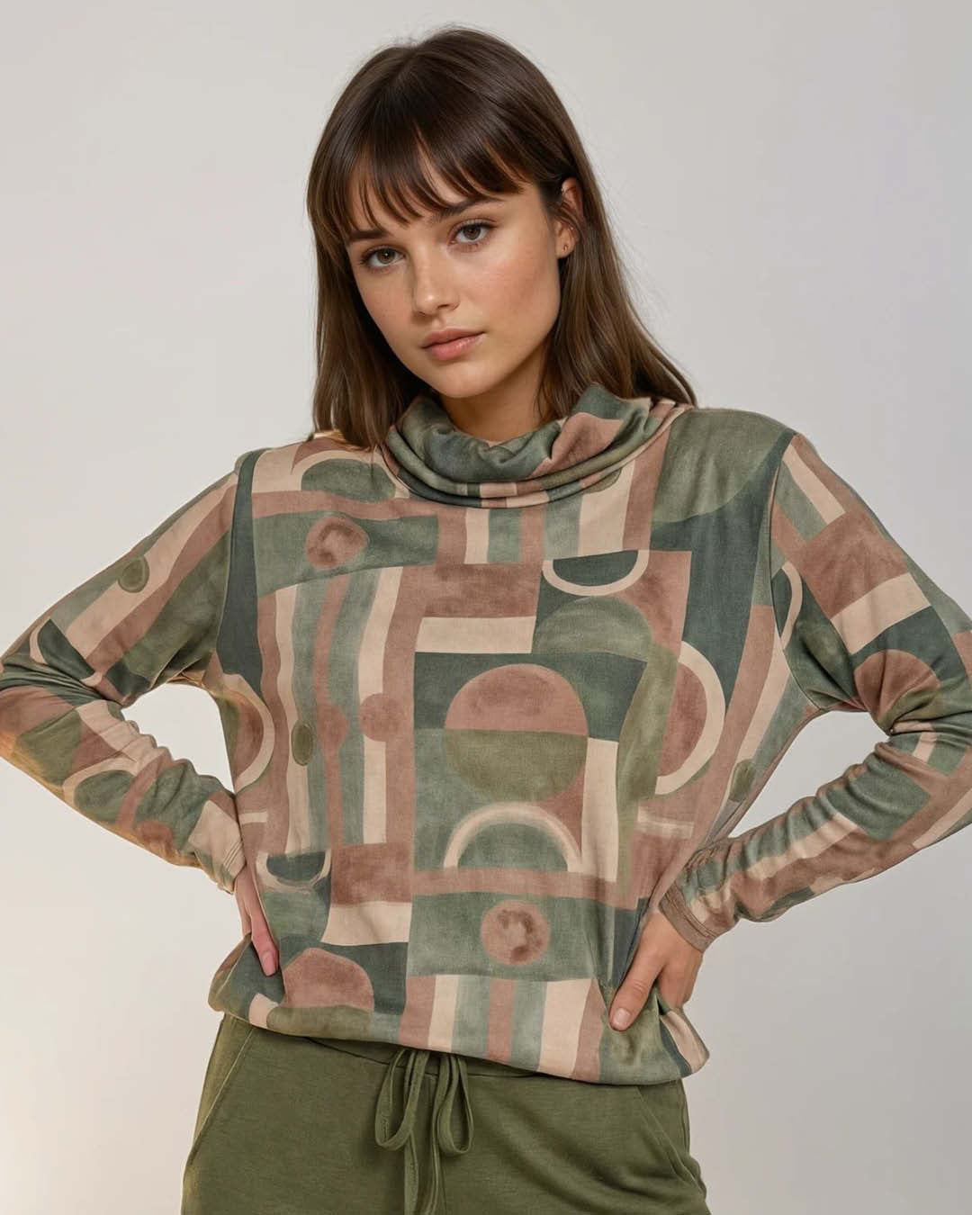 De Blouson Nico met wijde kol uitgevoerd met een grafisch dessin in army kleurstelling. De cosy fijnbrei kwaliteit en losvallende pasvorm zorgen voor een moderne uitstraling.