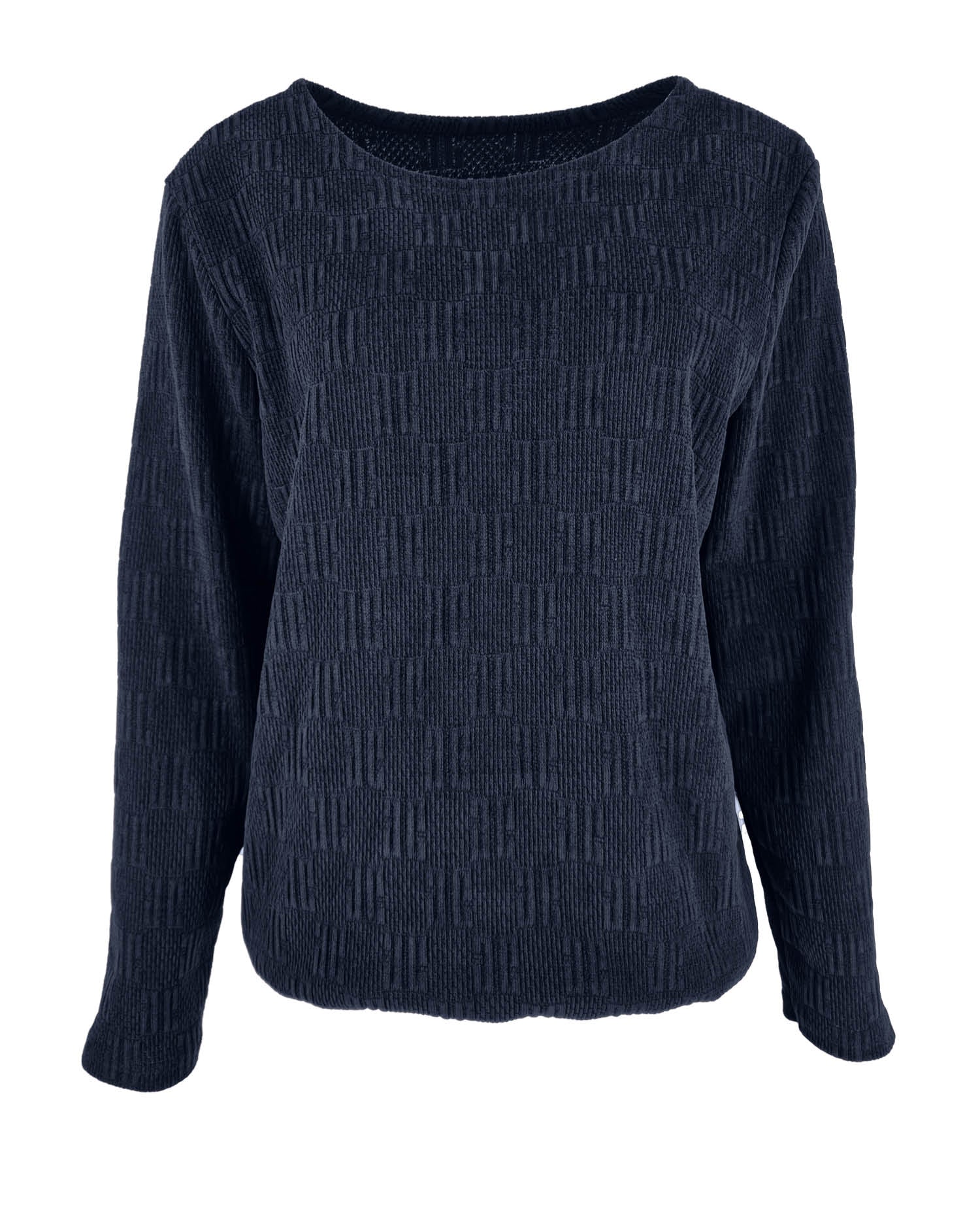 De blouson "Sisi" in navy met grafisch jacquard dessin en heeft een losvallend, comfortabel model. Het elastiekje aan de onderkant zorgt dat de blouse netjes op zijn plek blijft zitten en geeft een verzorgde uitstraling.