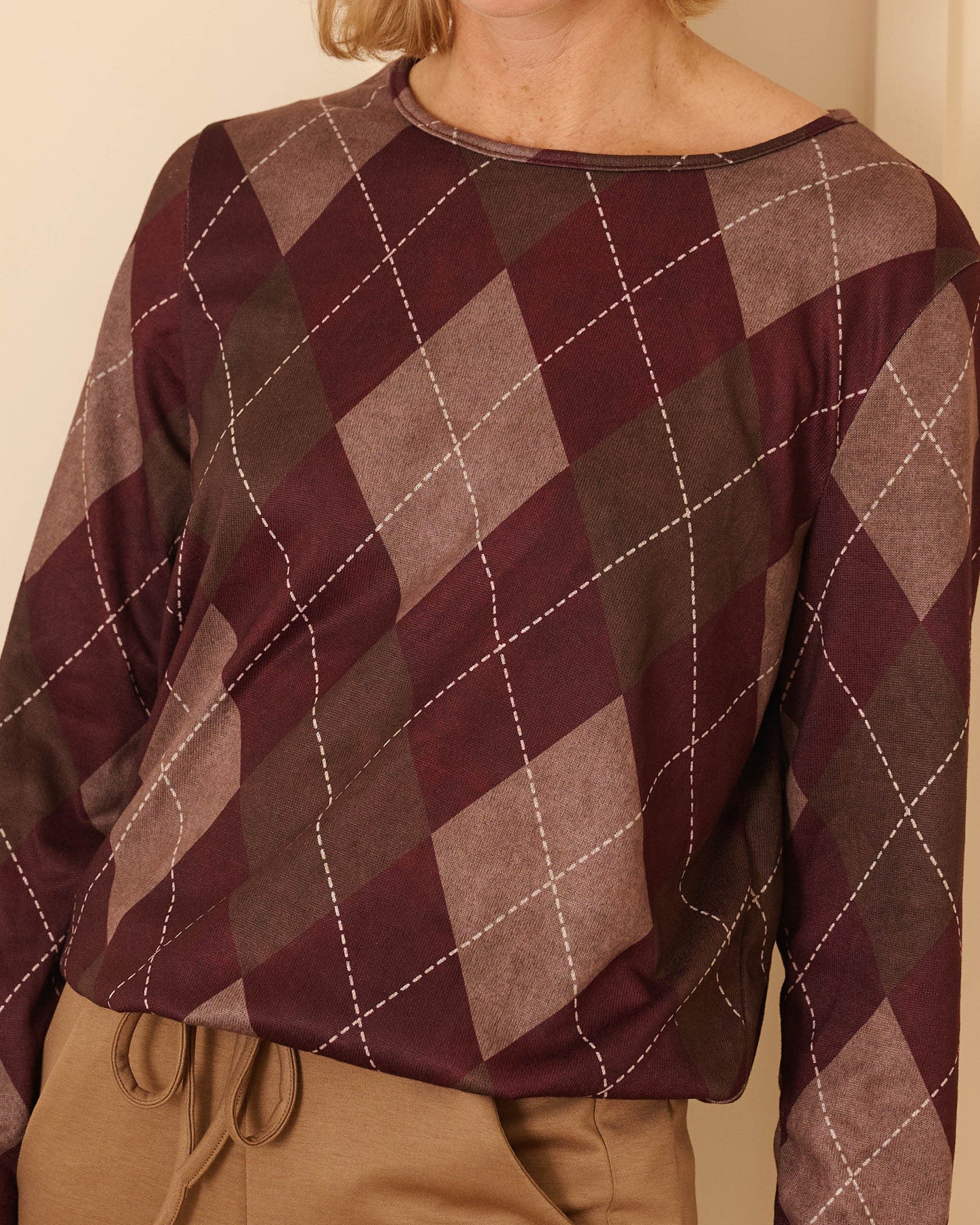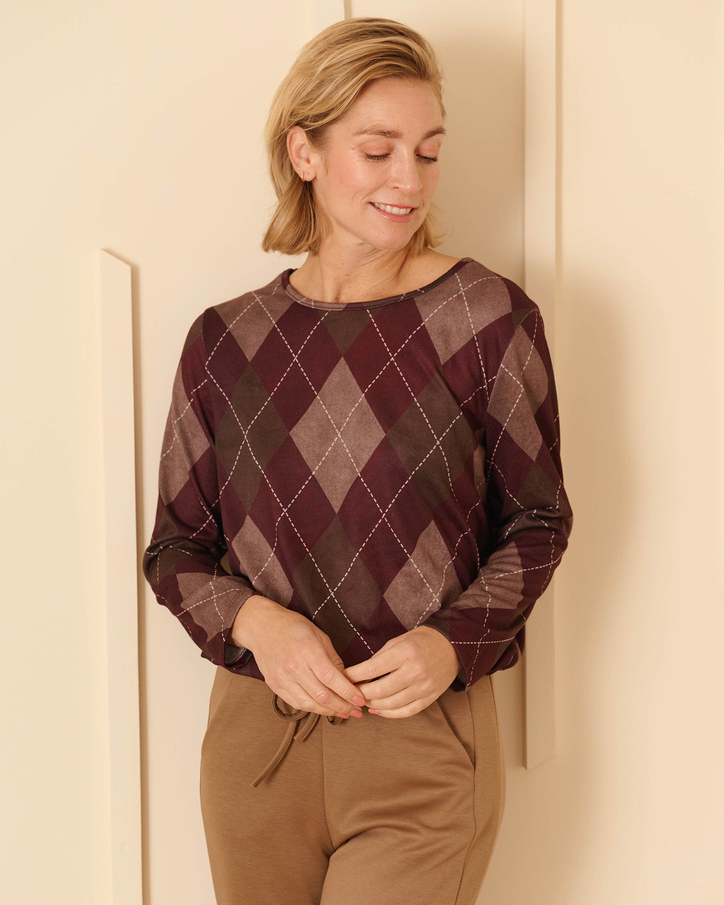 Blouson Sisi in beaujolais is gemaakt van een cosy fijnbrei kwaliteit met een stijlvol grafisch ruitdessin. De losvallende pasvorm en elastische zoom zorgen voor een lichte ballonvorm, waardoor deze top vrouwelijk en comfortabel valt. De ronde hals en lange mouwen geven een klassieke uitstraling die past bij elke stijl. Verkrijgbaar in beaujolais, bruin en beige.