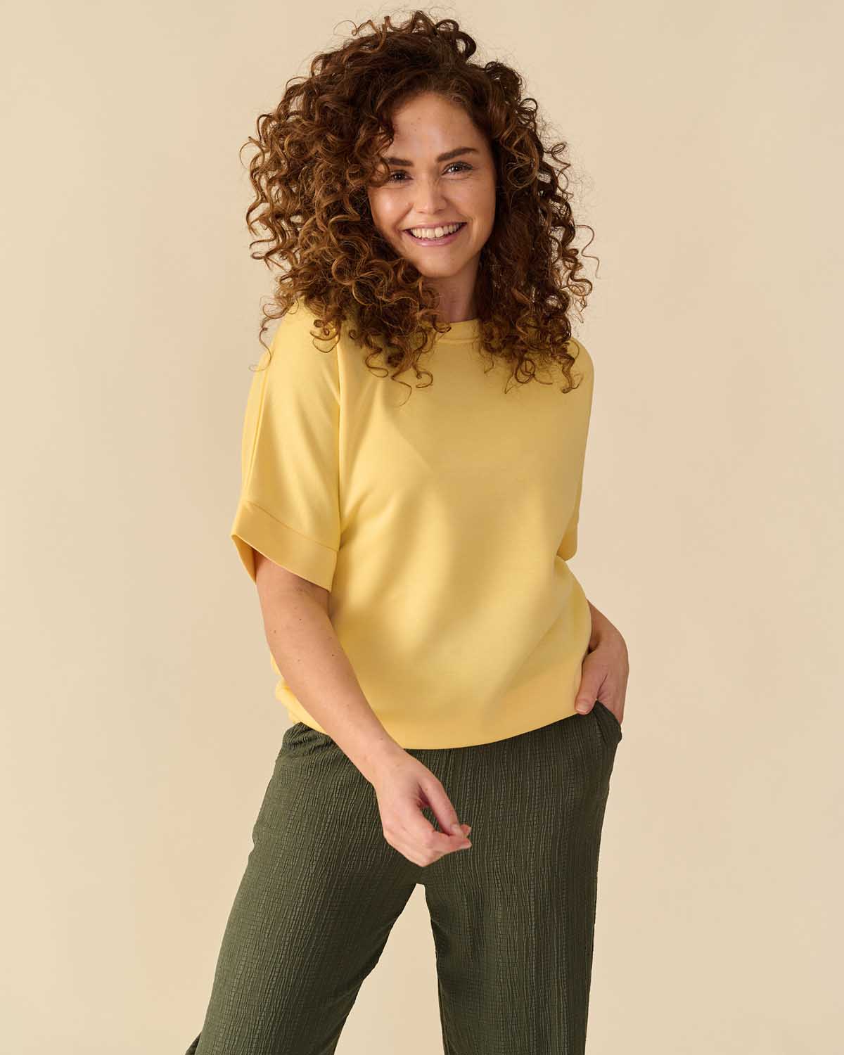 De Jet trui in geel is een losvallende trui met een sportieve en trendy uitstraling. Het relaxte model en de wijde mouwen geven de trui een nonchalante look. De trui heeft korte, wijde mouwen en een ronde hals en sluit zonder sluiting. De stretchkwaliteit zorgt voor extra comfort en een prettige pasvorm, ideaal voor elke dag. Deze trui is verkrijgbaar in meerdere kleuren zoals off-white, beige, army, navy, Jeans, licht-blauw, tulprood, roze en geel. Geel geeft de trui een zonnige en vrolijke uitstraling. Deze kleur brengt direct energie in je look. De combinatie van Jet trui en geel maakt dit item uniek.
