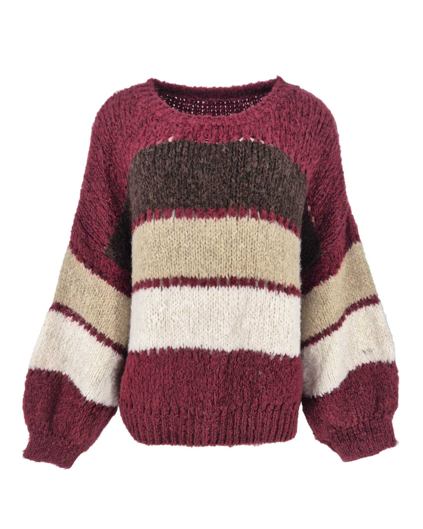 De trui “Raya” in bordeaux met bruin streep is dé perfecte combinatie van comfort en stijl. Deze grof gebreide chunky trui voelt heerlijk zacht aan en valt losjes, waardoor hij ideaal is voor een relaxte maar toch trendy look. Met de ronde hals en lange mouwen is de Raya perfect om te dragen tijdens frisse dagen. Dankzij de heuplengte draag je deze trui makkelijk boven een pantalon of rok. Het speelse streepdessin geeft je outfit een frisse uitstraling en maakt dit model een echte blikvanger in je garderobe. Verkrijgbaar in meerdere kleuren, zoals licht-blauw en taupe, zodat je altijd kunt kiezen welke tint het beste bij jouw stijl past.