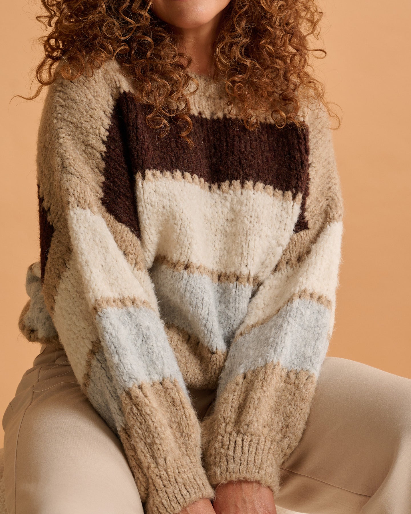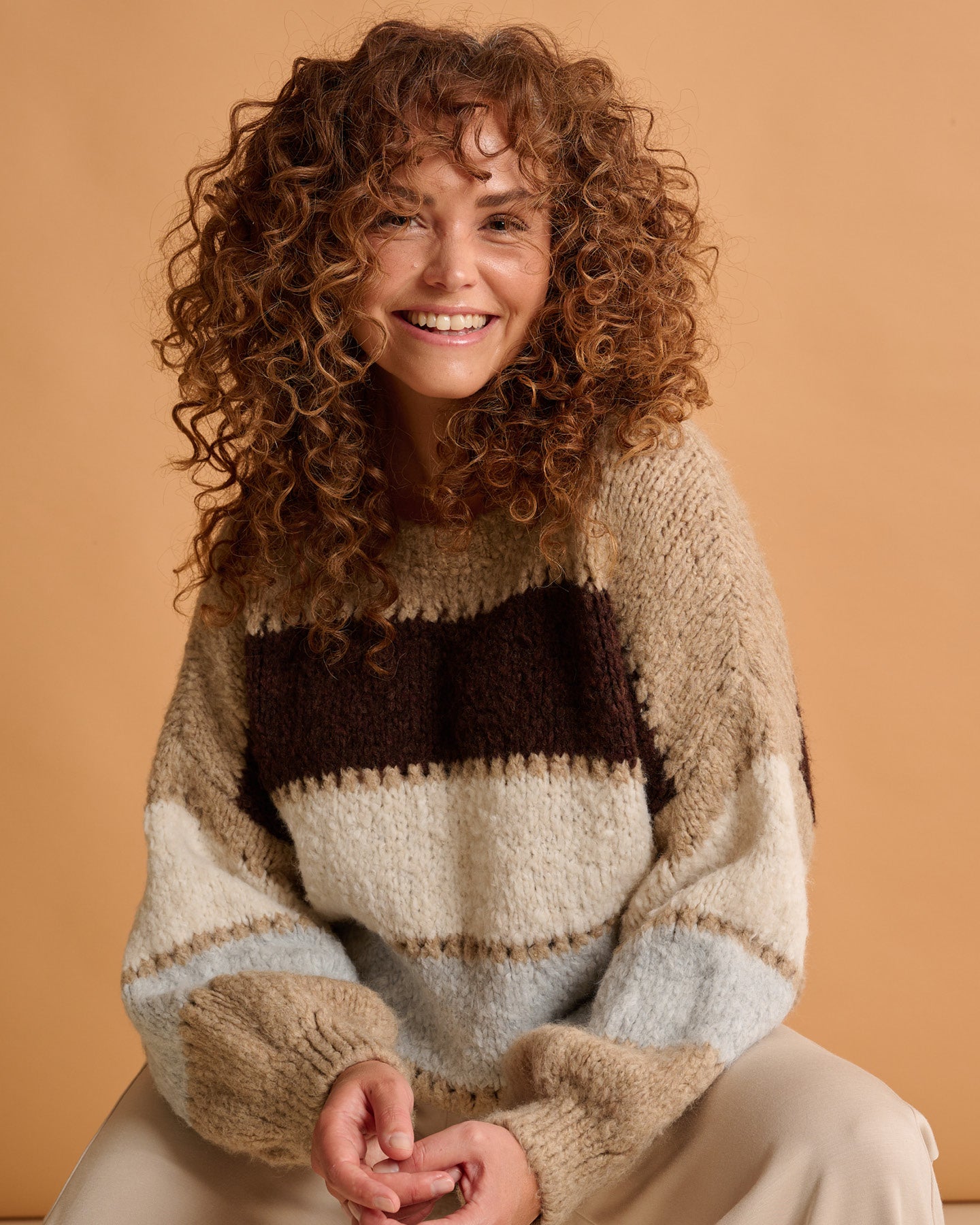 De trui “Raya” in licht-blauw met bruin streep is dé perfecte combinatie van comfort en stijl. Deze grof gebreide chunky trui voelt heerlijk zacht aan en valt losjes, waardoor hij ideaal is voor een relaxte maar toch trendy look. Met de ronde hals en lange mouwen is de Raya perfect om te dragen tijdens frisse dagen.
