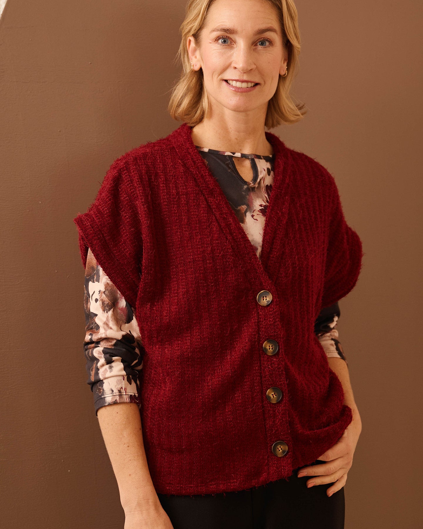 Het vest Scarlet in beaujolais is een heerlijk zacht chenille vestje met korte mouw. De diepe V-hals met knoopsluiting geeft een moderne, vrouwelijke uitstraling. De chenille stof voelt warm en luxe aan, perfect voor de koelere dagen. Verkrijgbaar in beaujolais, bruin en navy.
